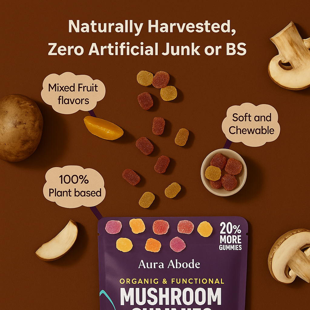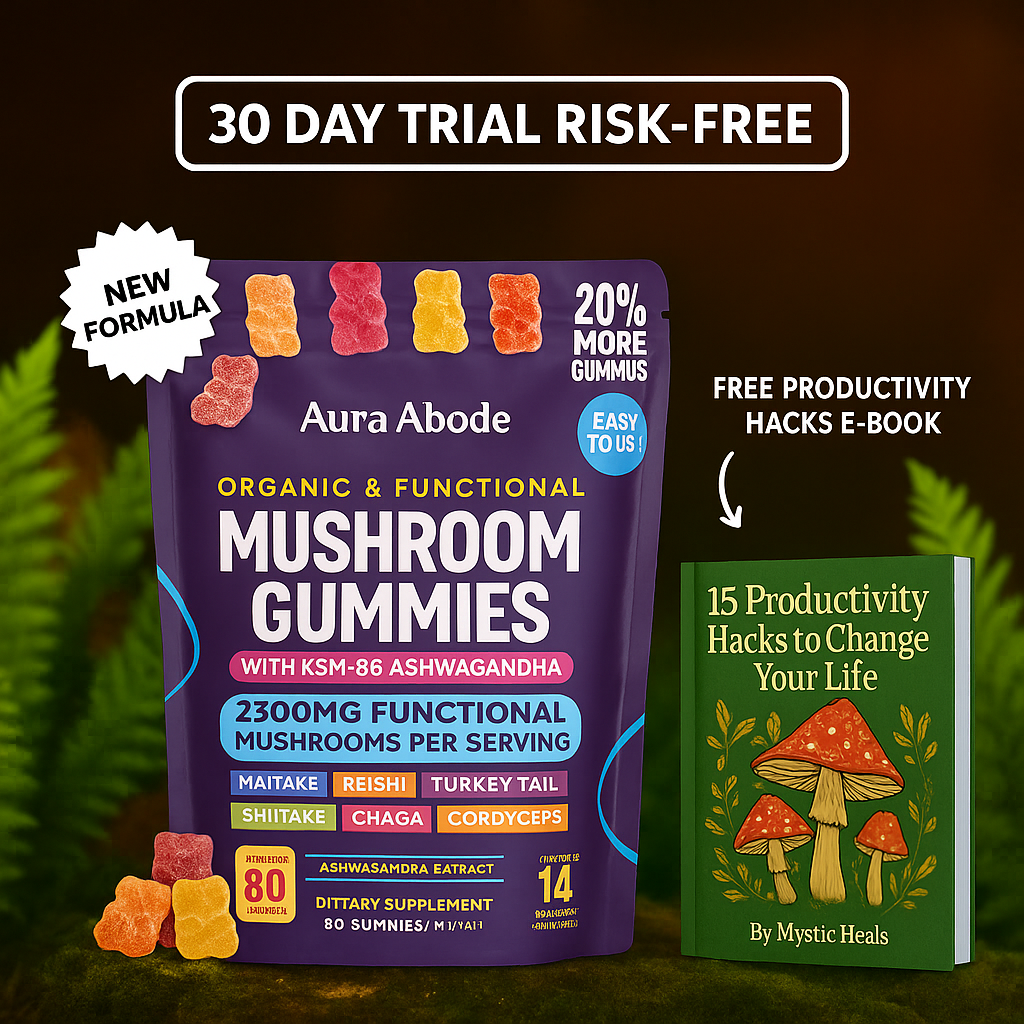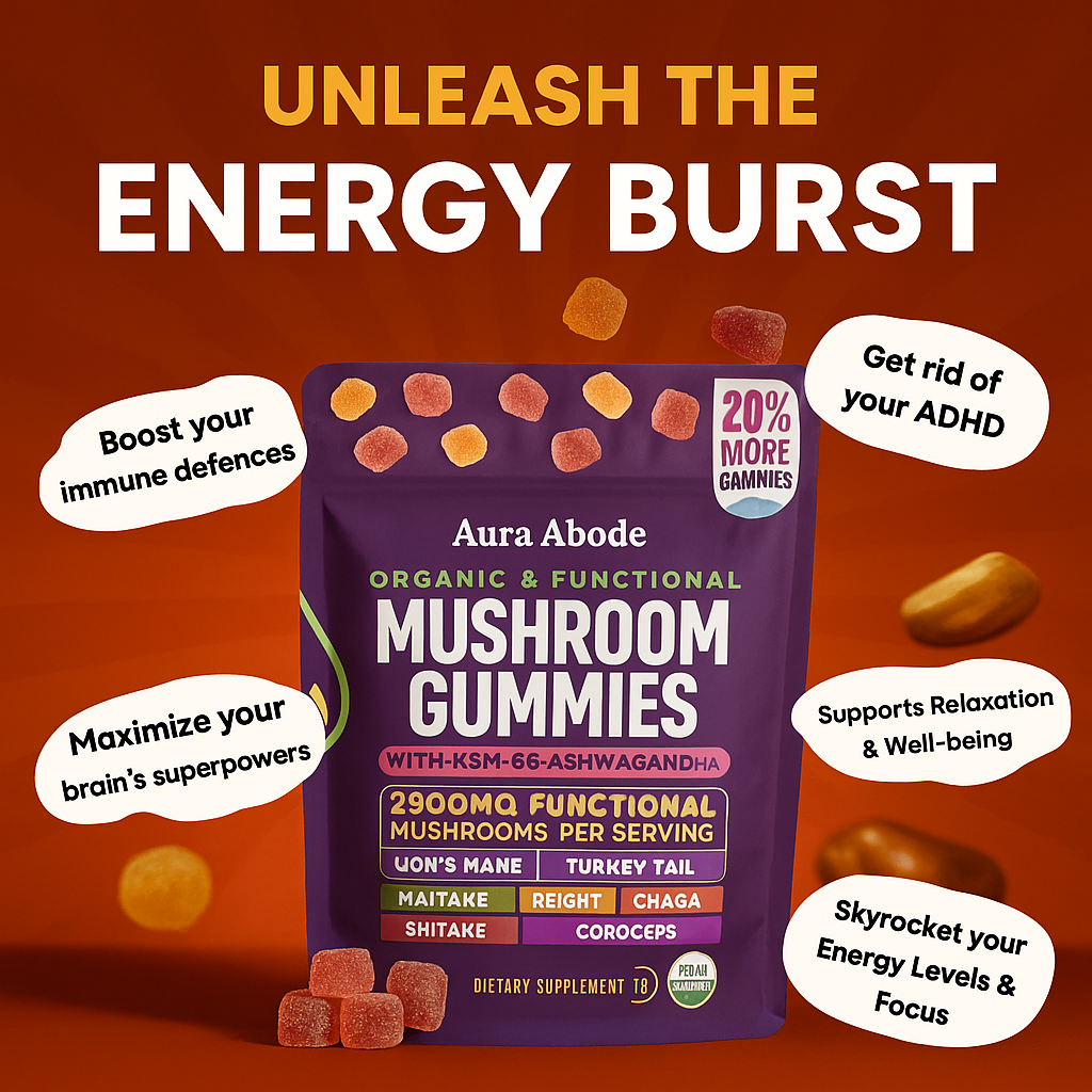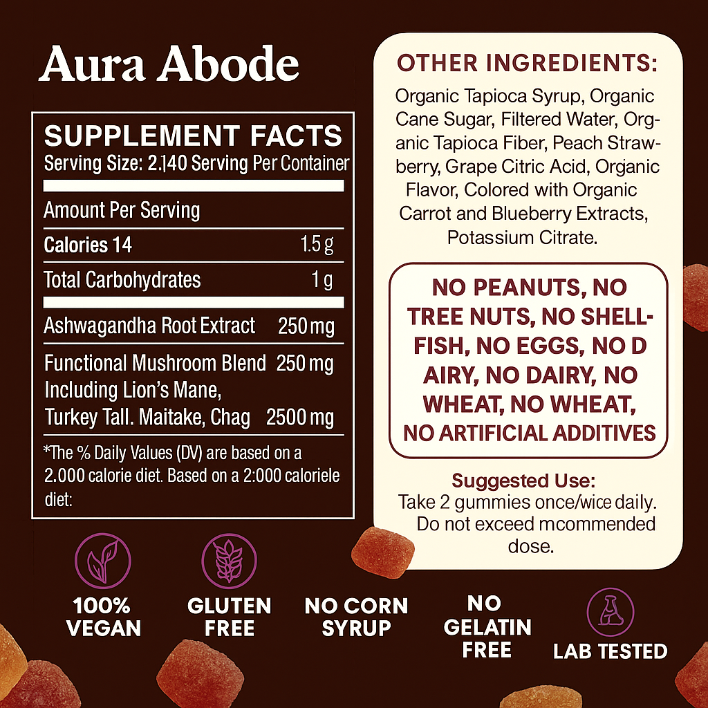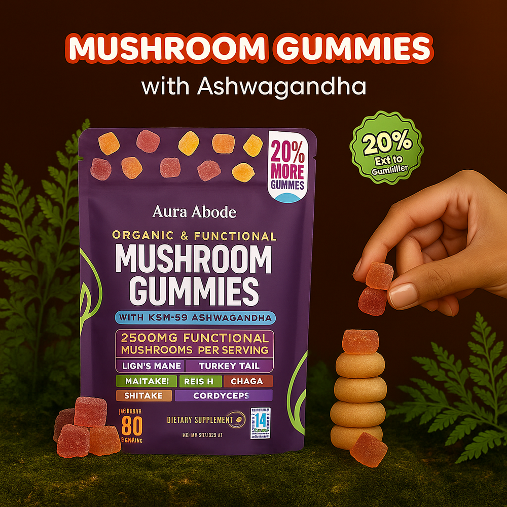 Unlock focused calm and natural energy with Aura Abode™ Mushroom Ashwagandha Gummies — a vegan, sugar-free supplement powered by the most researched adaptogens.